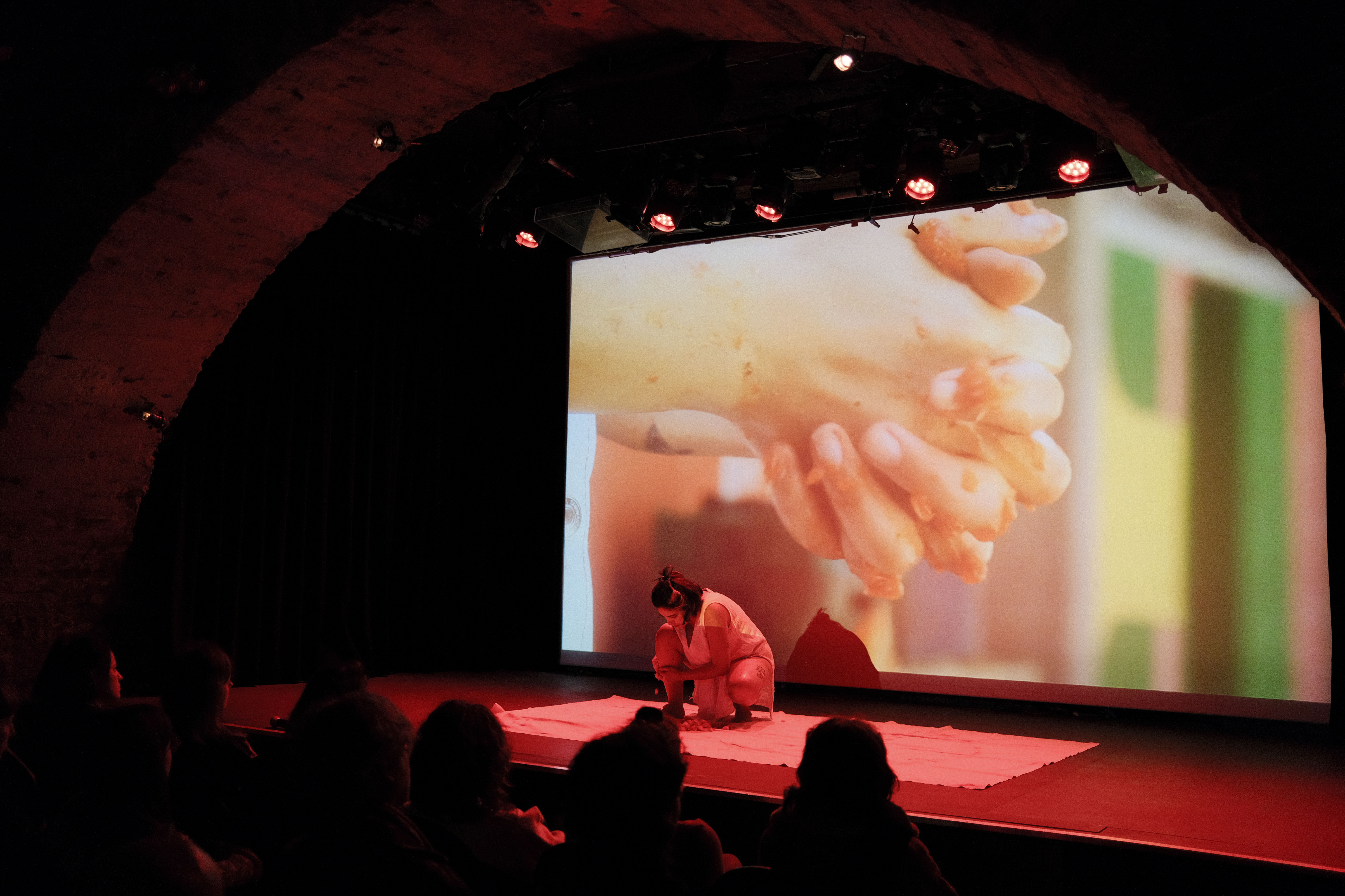 After taking a “shower” with strawberries, the artist generously narrates the colonial history of this red fruit and, navigating between Spanish and French, recites to the audience poems of resistance and rebellion about the migrant bodies of the south.